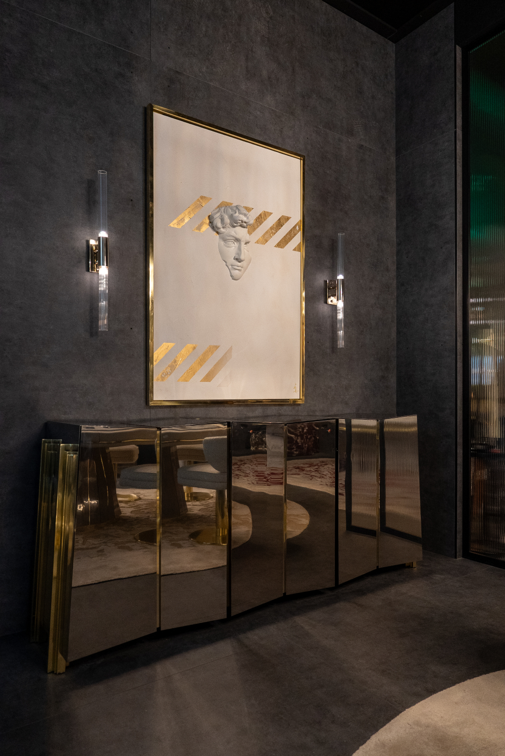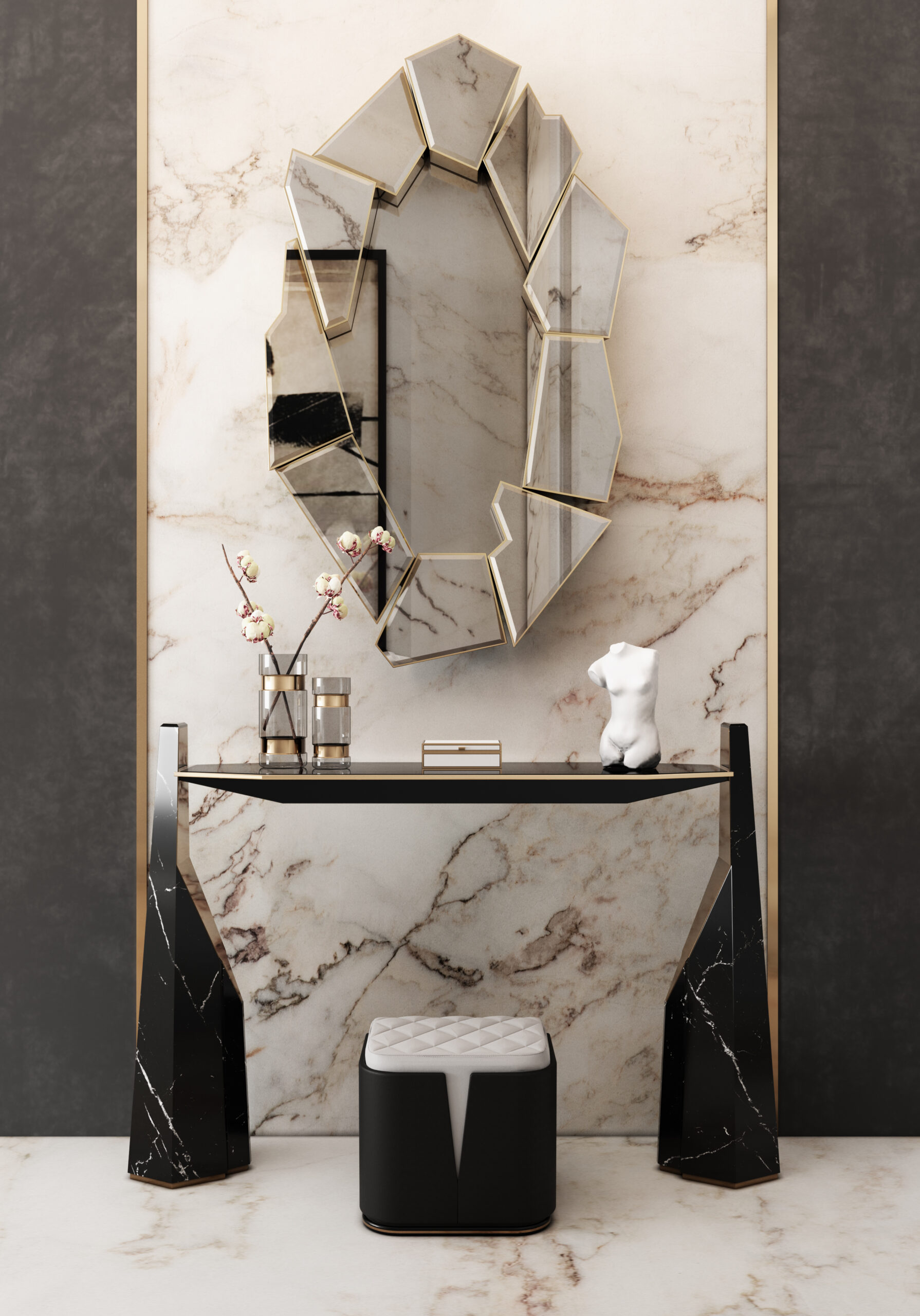 The Myllo console is an innovative design symbol that showcases artistry and functionality. Its versatile composition, which ranges from Nero Marquina marble to polished brass, creates a striking contrast. Designed with a bridge-like structure, Myllo draws inspiration from contemporary architecture, highlighting a bold figure and an avant-garde aesthetic. This statement piece embodies structural ingenuity and timeless elegance.