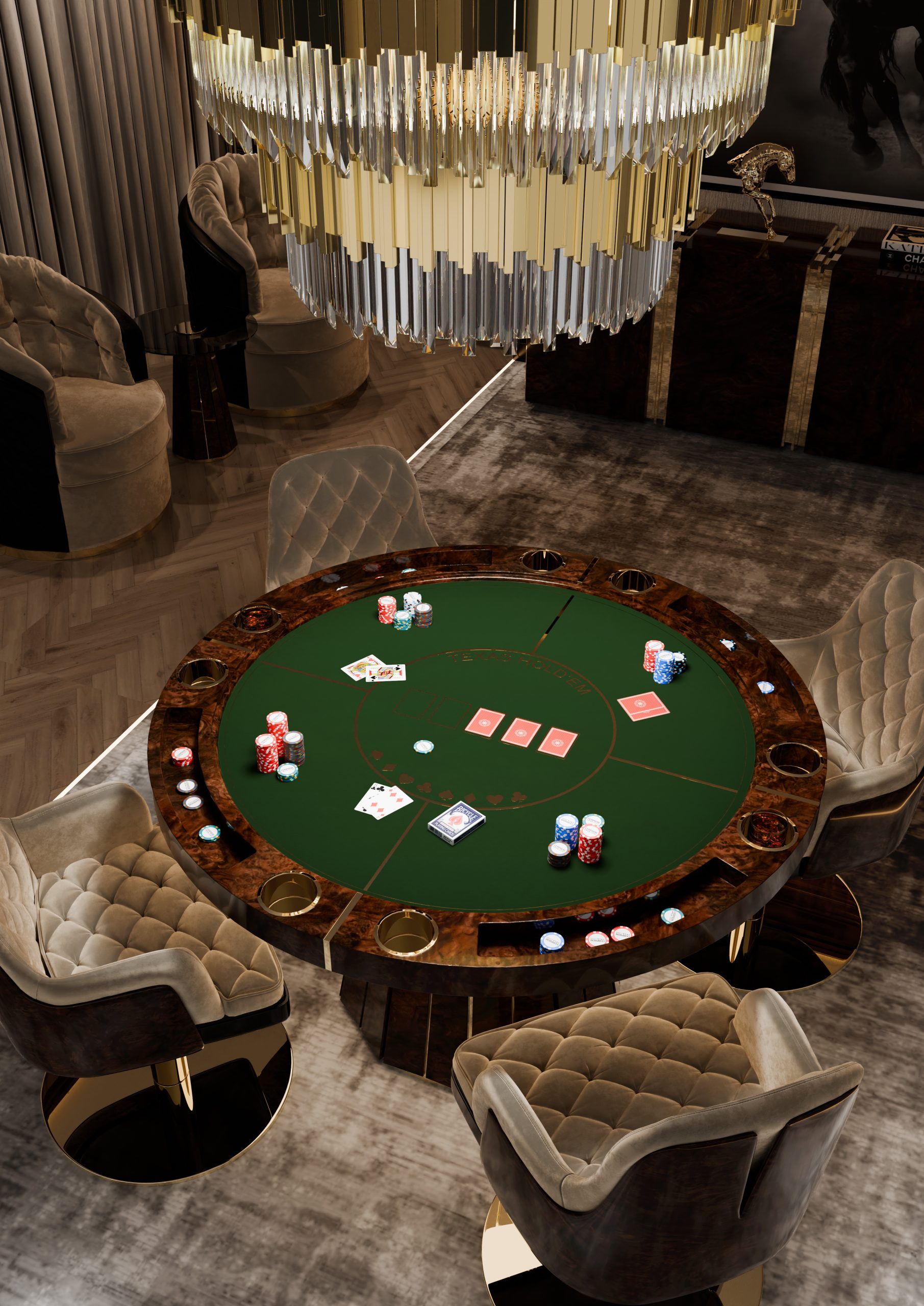 The Darian II poker table is a bold fusion of elegance and durability, designed to elevate any gaming or entertainment space. Its timeless circular form is wrapped in a supple leather rim, ensuring style and comfort. This design boasts a robust wooden structure accentuated with exquisite polished brass details, highlighting its superior craftsmanship.