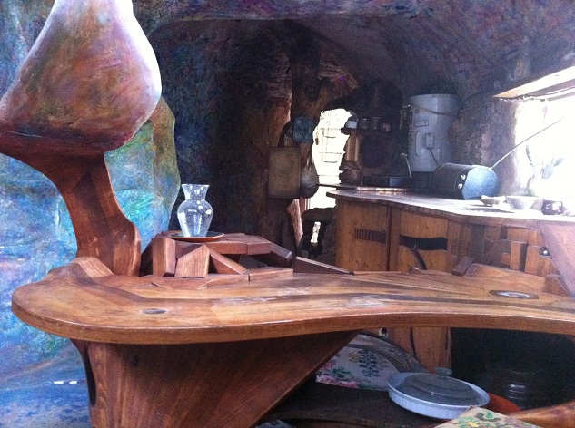 This house was created by artist Michael Kahn and his wife Leda Livant with found materials over a period of 28 years. The compound consists of 3 acres of land and evolved over the years. One of the buildings, the “Hippodome”, is a mosaic-covered creation that looks like a hippo emerging from a lake.