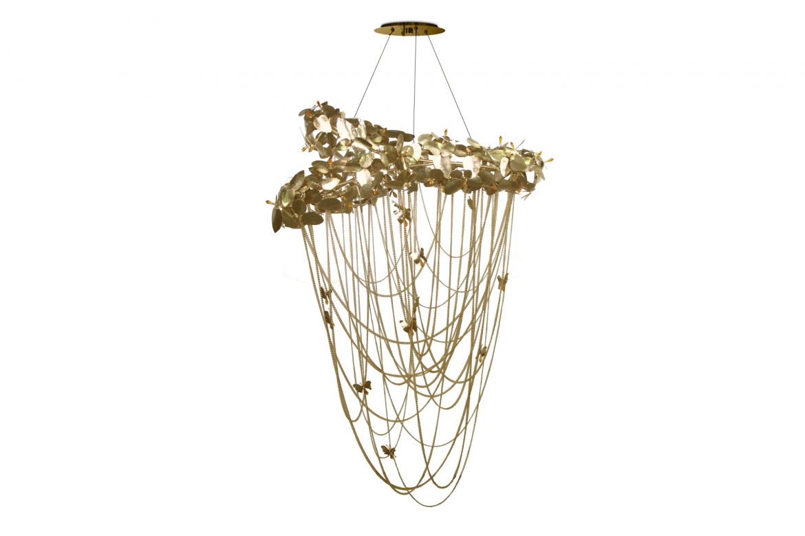 This amazing chandelier is inspired by Alexander McQueen. This masterpiece is a gold chandelier, as powerful as his exhibitions, combining the best luxury with the most exquisite handmade materials. Made with gold plated hammered brass, handmade butterflies and majestic flowers ending with the touch of beautiful crystals. Bold and feminine, this creation is a real lumen sculpture.