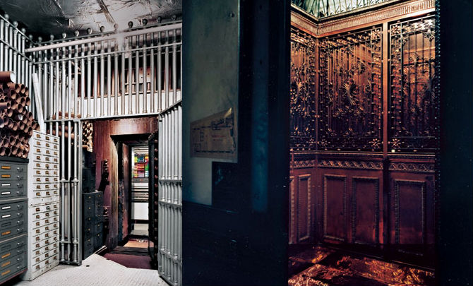 On the left Maisel stores his work in the original safe-deposit vault on the right the beautiful copper elevator